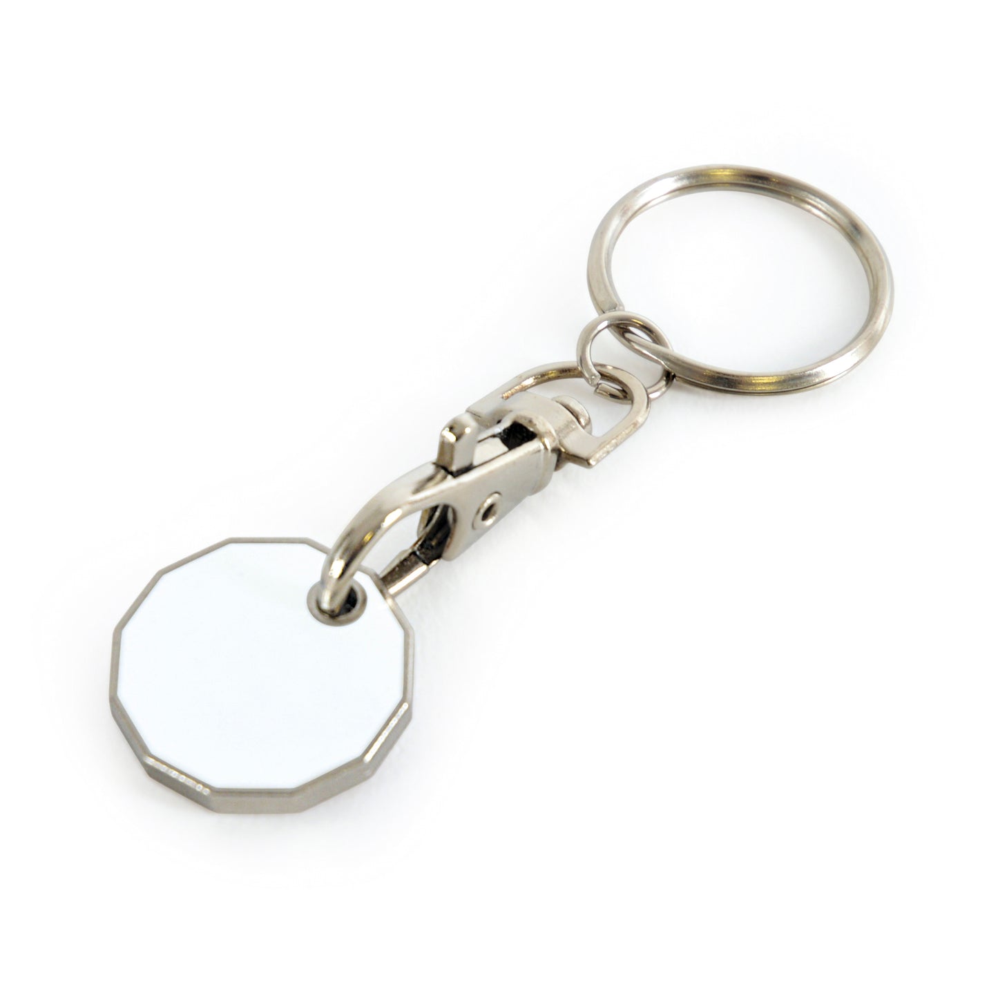 Metal 12-sided trolley coin keyring with detachable trigger clip and split ring attachment. Available with multi-colour imprints on both sides of the coin.