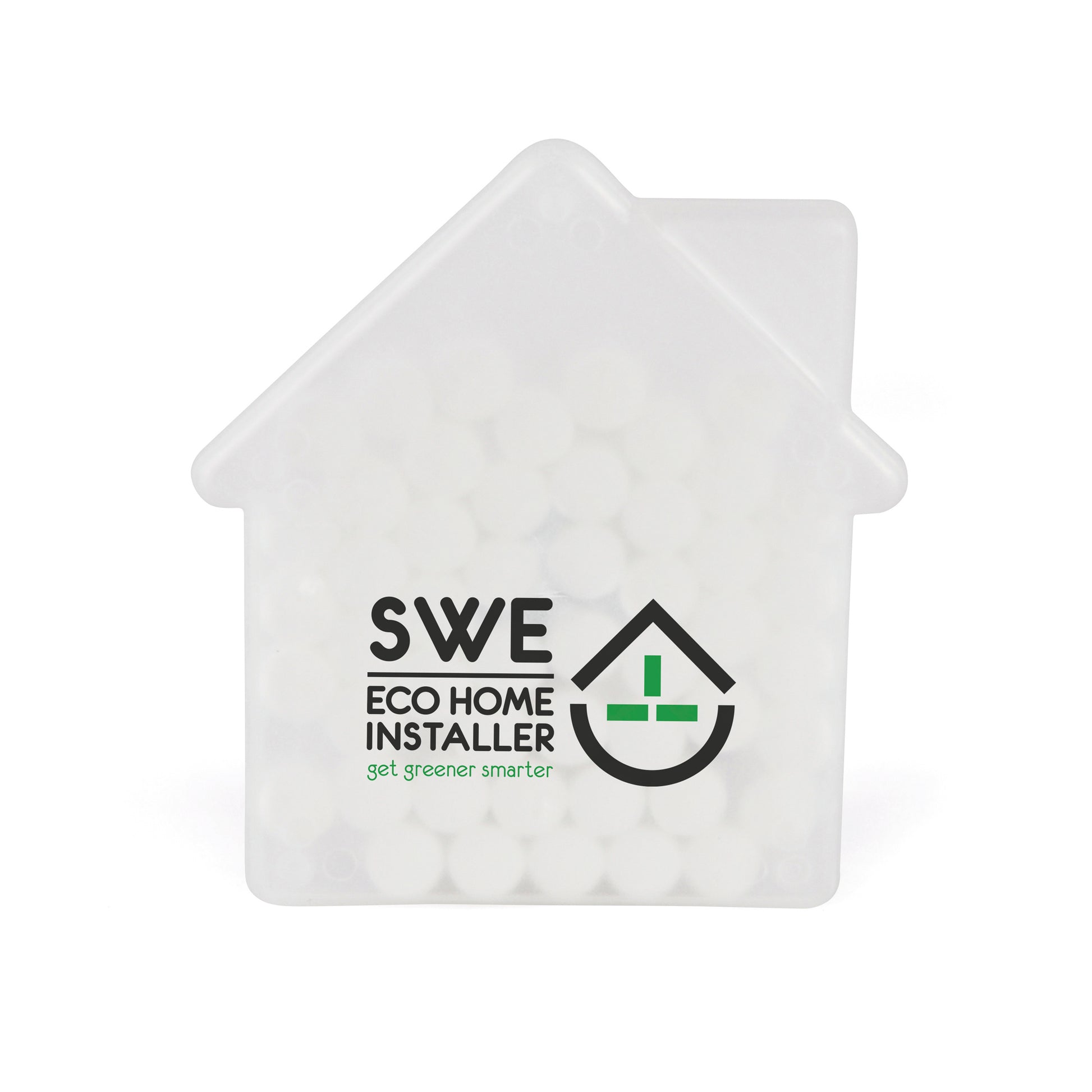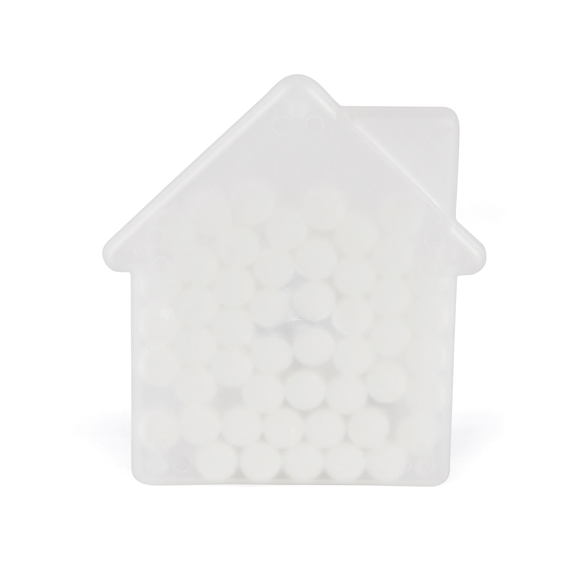 Plastic house shaped mint card with approx. 50 sugar free mints per card (approx. 8g). Ingredients sticker and seal included. Gluten free and Vegetarian, not suitable for Vegans due to bees wax.