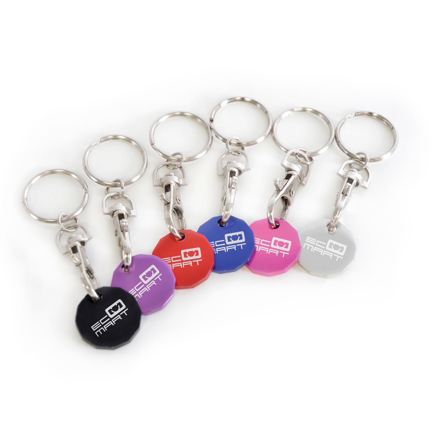 12 sides metal trolley coin keyring with detachable carabiner clip and supplied with a split ring attachment