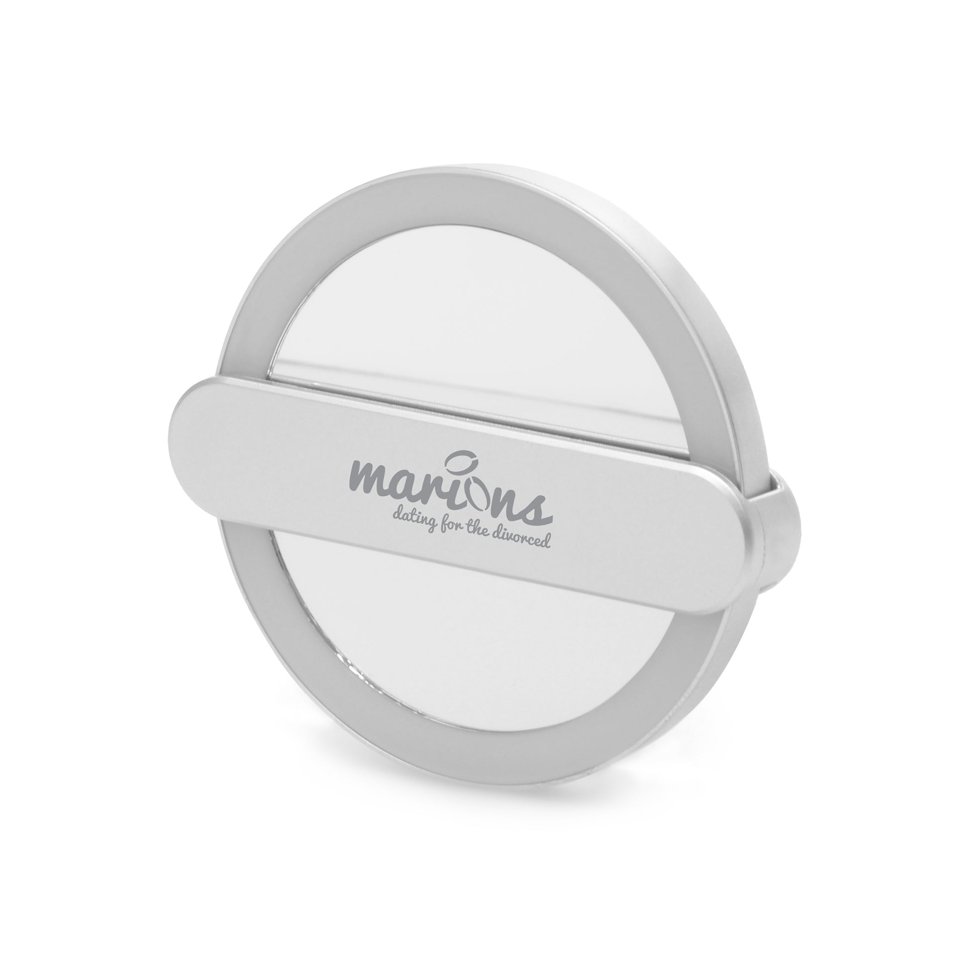 ABS plastic 115mm diameter travel mirror with built-in battery powered ring light and fold-out stand/handle.