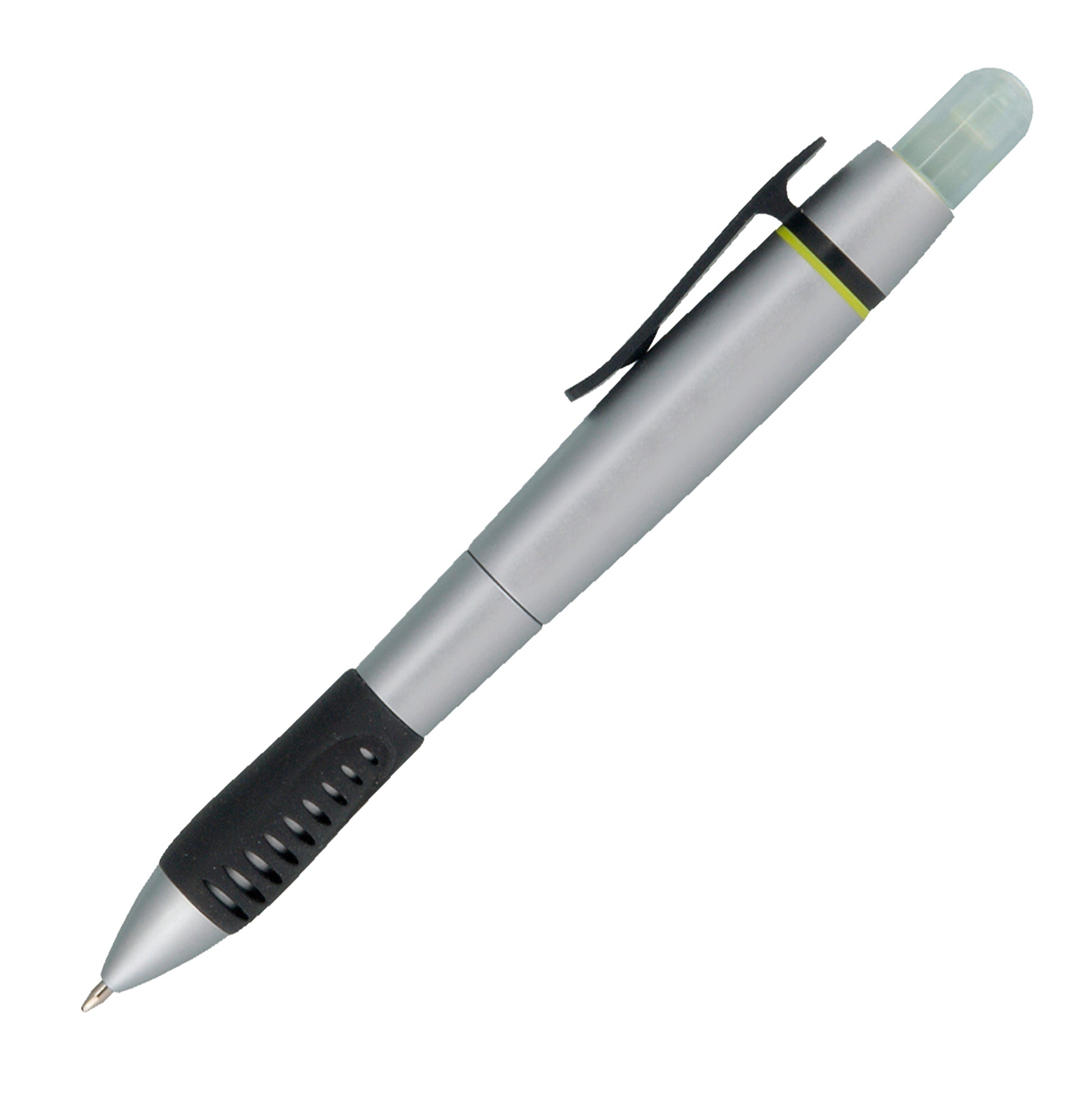 A stylish and handy silver twist action pen and highlighter in one. Highlighter cover is a full off ventilated cap.