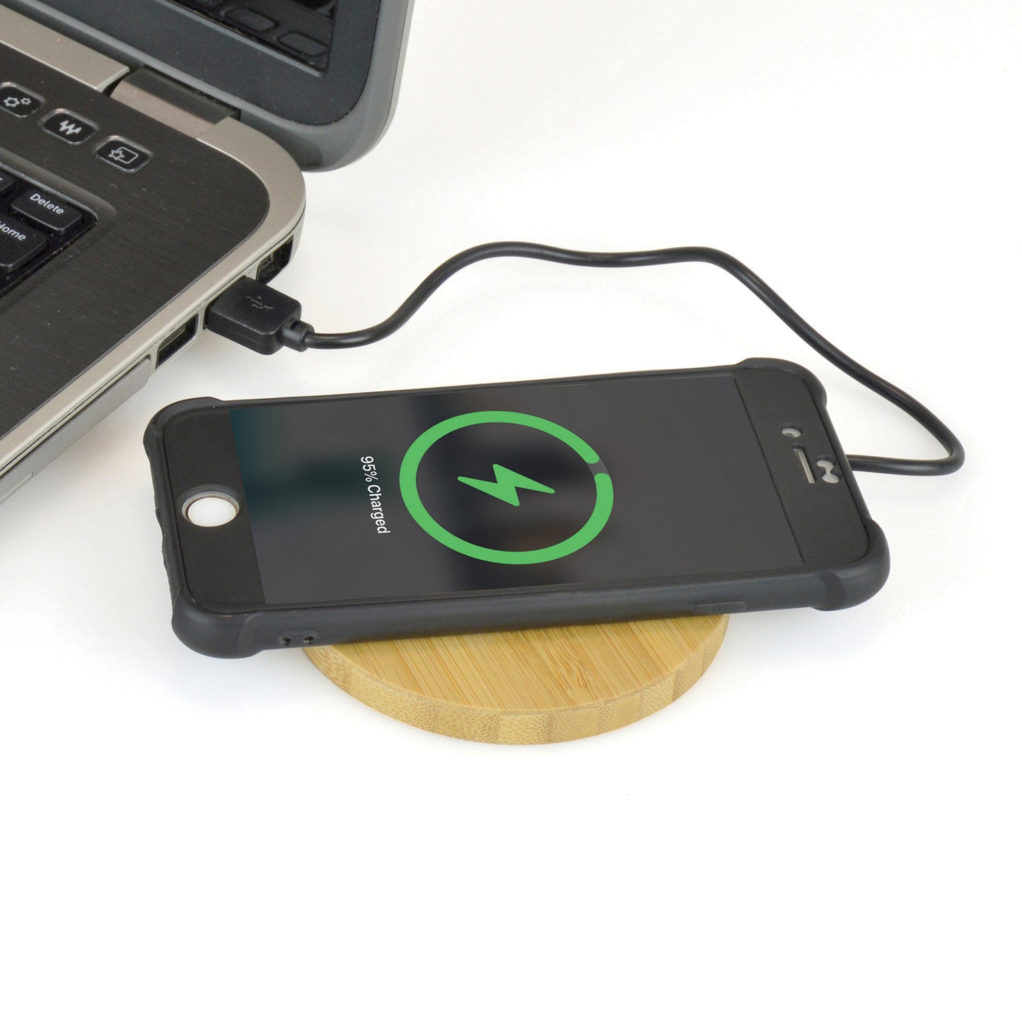 Round magnetic wireless bamboo charger with USB cable and light up logo